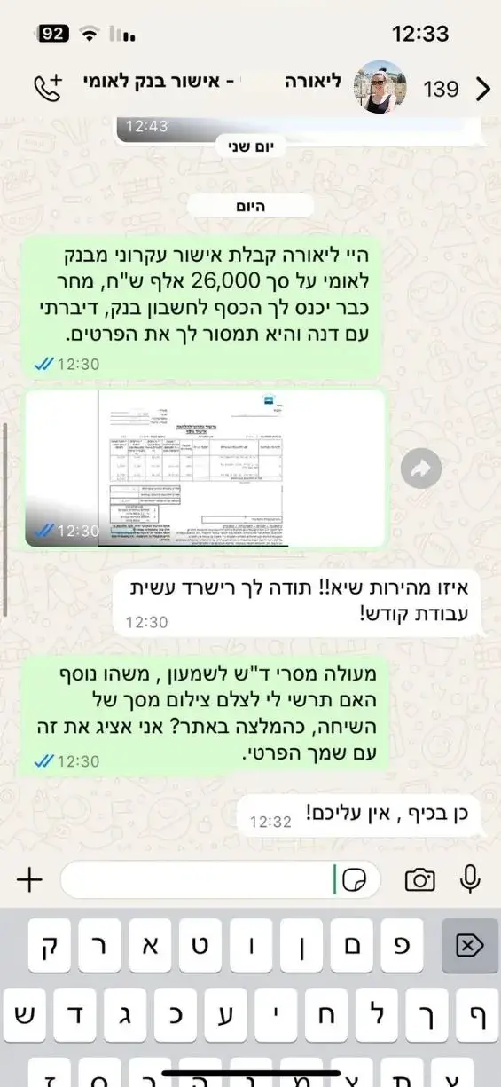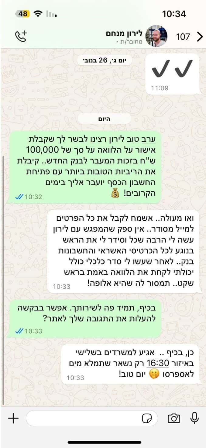 פורסם ב- Ofek Lifshitz6 נובמבר 2025Trustindex מוודא שהמקור המקורי של הסקירה הוא Google. כסף=זמן הייתי צריך כסף מהר לרכב. התהליך באתר היה פשוט, הדוח היה ברור וקיבלתי את הכסף בזמן. עושה את העבודה. כללל ההצעות - פועלים, דיסקונט, לאומי וואלה רבו אלי באלוהים. תנאי תשלום נוחים גם מרכנתיל למרות שההצעה שלהם הייתה בריבית גבוה. הכל בדוח עשיתם לי שכ-ל.פורסם ב- Ilay Harari6 נובמבר 2025Trustindex מוודא שהמקור המקורי של הסקירה הוא Google. מילאתי את השאלון באתר (קצת ארוך חייב להגיד), קיבלתי את הדוח והנציג שלכם שלומי עזר לי לבחור את ההצעה הטובה ביותר. תוך יומיים הכסף היה בחשבון וואלה מפתיע חא ציפיתי.פורסם ב- gil raviv26 אוקטובר 2025Trustindex מוודא שהמקור המקורי של הסקירה הוא Google. שירות מהיר והאיכותי! כל המידע קבלתי למייל והמערכת שלכם עזרה לי במציאת הלוואה סוכר! וואלה לא ידעתי בכלל שיש לי אפשרות להלוואה דרך קרן ההשתלמות שלי וואלה חידשתם.פורסם ב- שירה שטרית23 אוקטובר 2025Trustindex מוודא שהמקור המקורי של הסקירה הוא Google. מקצוענים, יחס אישי ושקיפות מלאה ממליצה!פורסם ב- Shani Shopen22 אוקטובר 2025Trustindex מוודא שהמקור המקורי של הסקירה הוא Google. שירות מדהים מקצועי ואיכותי תודה רבה עזרתם לי ממש אין עליכםפורסם ב- אליאן אדרי22 אוקטובר 2025Trustindex מוודא שהמקור המקורי של הסקירה הוא Google. קיבלתי שירות מעולה והלוואה בתנאים טובים, תודה רבה מרוצה מאודפורסם ב- Ori Frediaro5 אוגוסט 2025Trustindex מוודא שהמקור המקורי של הסקירה הוא Google. קיבלתי שירות מצויין הקשיבו לי לצרכים שלי ועשו הכול לעזור לי הגעתי דרך האתר עם סימני שאלה אבל אני הכי מבסוט עליהם